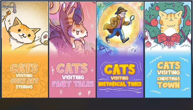 In Cats Visiting #2, a charming bundle for PC, players join an adventurous group of delightful cats as they explore four whimsical settings. Each realm—an art studio, a holiday town, a fairy-tale landscape, and a historical time capsule—offers unique experiences. The easygoing gameplay invites players to wander and discover, perfect for fans of casual and cozy gaming alike.