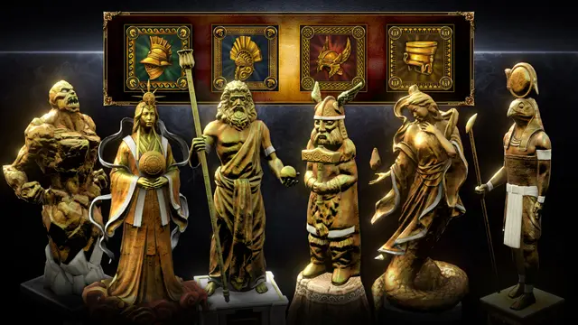 Transform your cities into monuments of power with the gorgeous alternative golden statue treatment for Temples and Town Centers. Now, each structure serving your civilization can embody the grandeur of the pantheon it represents. The stunning visuals ensure that your settlements not only function as operational hubs but also reflect the mythic legacy of the major gods.