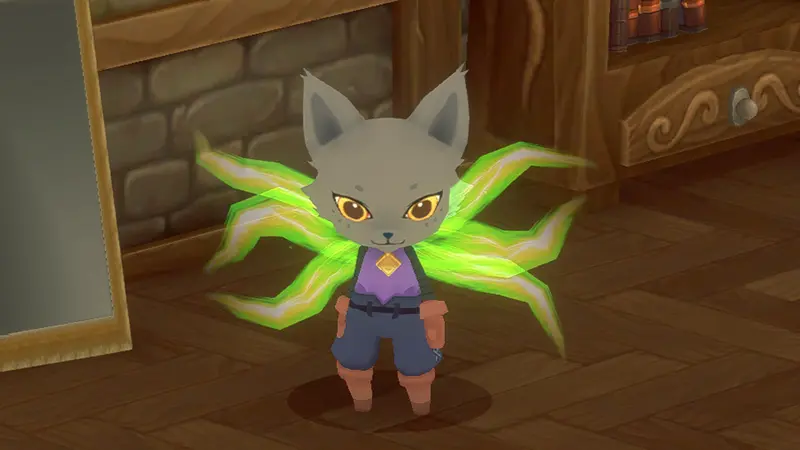 Green Mythical Wings transforms the appearance of Nyanza, the protagonist in the charming action RPG Kitaria Fables. This cosmetic add-on gives players the chance to outfit their feline warrior with ethereal green wings that shimmer with mythical energy. The wings serve as a visual enhancement that personalizes your character's look throughout the farming and combat adventure.