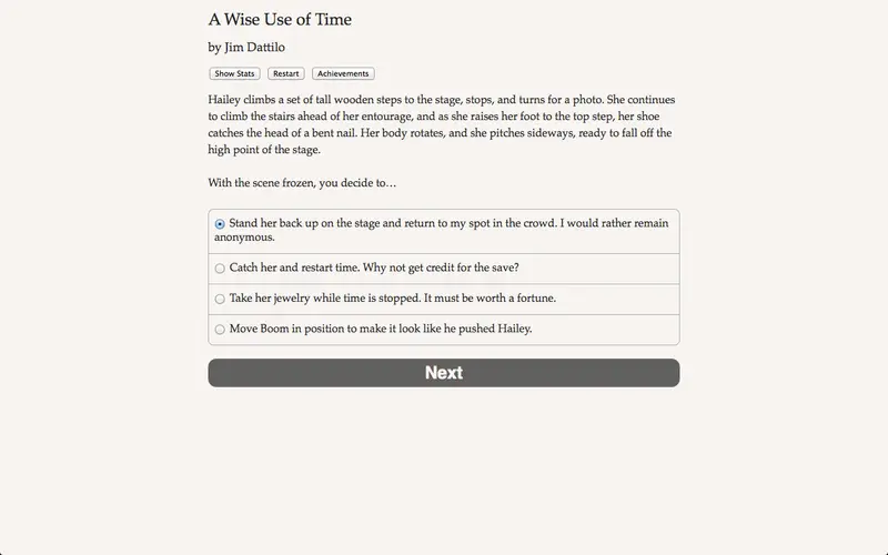 In A Wise Use of Time, players harness the extraordinary ability to freeze time. This innovative mechanic allows you to navigate a world where you can ransack a casino, save someone in peril, or even bend the fabric of fate itself. With a sprawling narrative crafted by Jim Dattilo, author of “Zombie Exodus,” this interactive fiction provides a captivating journey driven entirely by your choices.