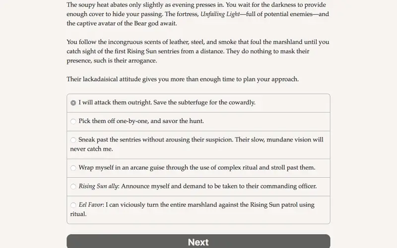 In Avatar of the Wolf, players step into a text-based fantasy adventure where the stakes are high: uncover the mystery behind the murder of the Wolf god. As the last avatar of Wolf, you must decide whether to avenge your fallen deity, rise against the pantheon, or reshape the world without their influence. This PC-exclusive game challenges players' imagination through a rich, narrative-driven experience without the need for graphics or sound effects.