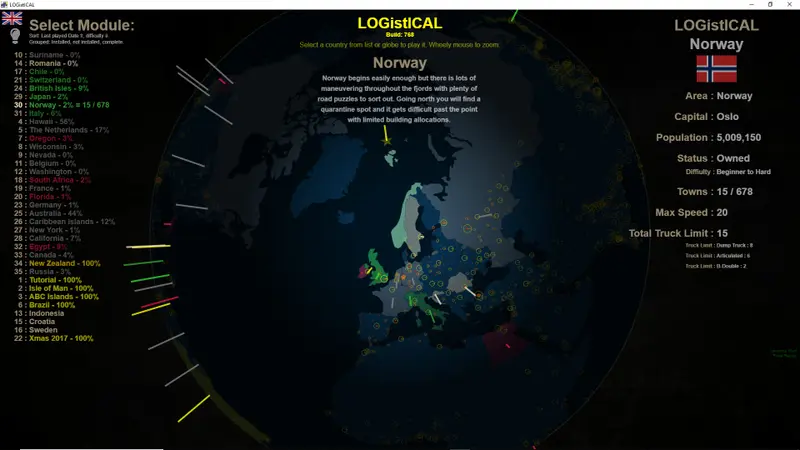In LOGistICAL: Norway, players engage with a rich open-world strategy puzzle game that challenges them to transport various cargoes throughout Norway’s expansive terrain. With over 600 towns to complete, this game invites players to strategize and navigate through intricate road networks, fjords, and local industries. Each successful delivery contributes to unraveling the vast web of puzzle-like challenges embedded in the game's design.