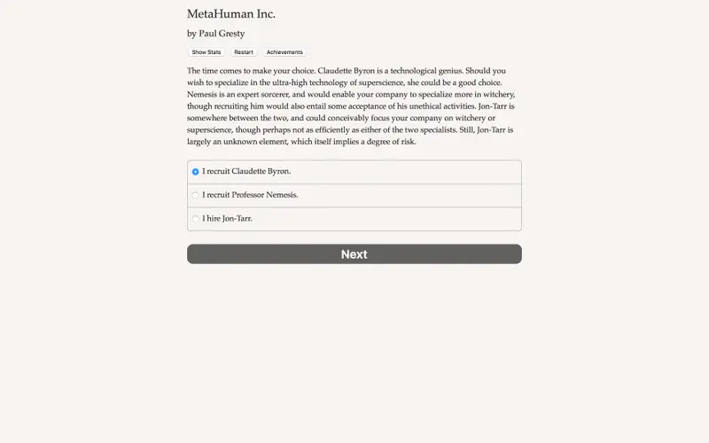 In MetaHuman Inc., players step into the shoes of a CEO managing a corporation selling superpowers to the highest bidder. This interactive novel by Paul Gresty, featuring a rich narrative spanning approximately 260,000 words, invites you to wield magic, craft cutting-edge technologies, and manipulate your company's stock value. Your choices define the path of the story, where your imagination is the only limit.