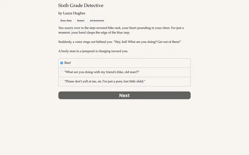 In Sixth Grade Detective, players step into the shoes of an amateur sleuth navigating the labyrinth of middle school. Roguish classmates, secrets, and mini-mysteries await as you use your investigative skills to solve cases and navigate personal dilemmas. No graphics or sound effects distract you; it's all about the text-driven experience that sparks your imagination.
