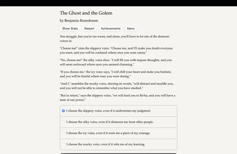 In The Ghost and the Golem, players find themselves in a tense 1881, where an antique magic amulet hints at a catastrophic future for their Jewish village on the border of Poland and Ukraine. As you navigate this interactive historical fantasy novel, penned by Benjamin Rosenbaum, uncover the intricate ties of community and the dark forces threatening your home. The story is driven by your decisions, offering hundreds of potential choices in a narrative rich with cultural depth and historical context.