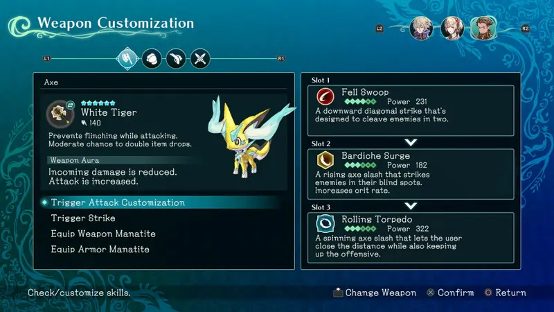 Next up is the Azure Dragon Sword, tied to the character Cyan. With its three techs, this sword refills the aura gauge on successful perfect dodges, rewarding skilled players. Like the White Tiger Axe, it enhances item drop rates. Furthermore, the weapon aura boosts attack power while mitigating damage received, offering a balance of offense and defense. This sword is perfect for players who enjoy a more aggressive playstyle while still needing strategic defense.