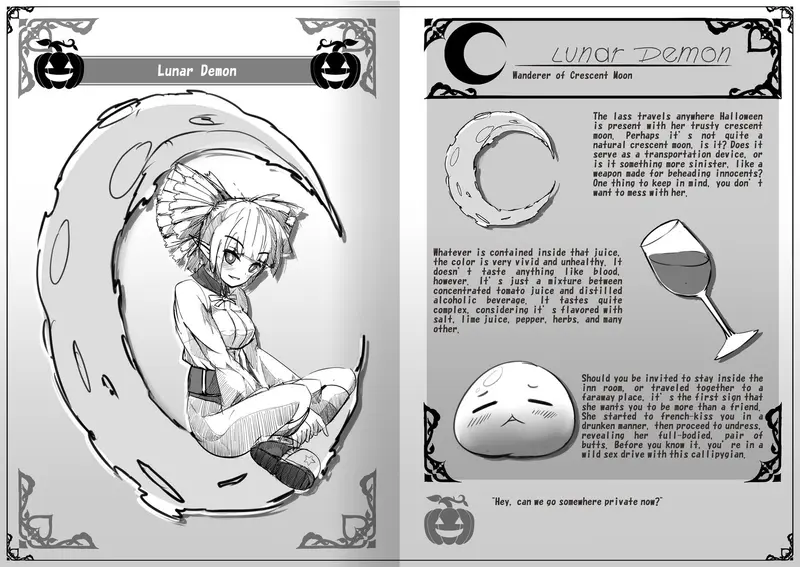 Each monster girl in this volume brings her own story and sex scene, enhancing the overall experience. The sketches reflect a variety of personalities and themes, appealing to fans of the genre. As the narrative unfolds, players witness how these characters interact during the Halloween festivities, providing an intriguing look at their world and relationships.