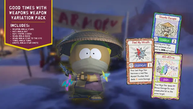 In SOUTH PARK: SNOW DAY! Good Times with Weapons Variation Pack for Xbox Series, players can step into the shoes of a shadowy Ninja. This DLC introduces the powerful Ninja Stars ranged weapon variation, allowing you to strike quickly and retreat into the dark. Master the art of stealth while navigating the whimsical and chaotic world of South Park, where your skills will be tested against quirky adversaries.