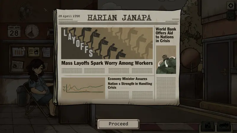 The game's distinct 90s-inspired visual style immerses you in a nostalgic atmosphere that reflects the era's bleakness. With a blend of dot textures, old-paper aesthetics, and a blueish filter, the art direction captures the mood of the time. This visual approach enriches the storytelling, grounding the player in the actual realities faced during the 1998 Asian financial crisis while highlighting the chaos of transitional Indonesia in a fictional narrative.