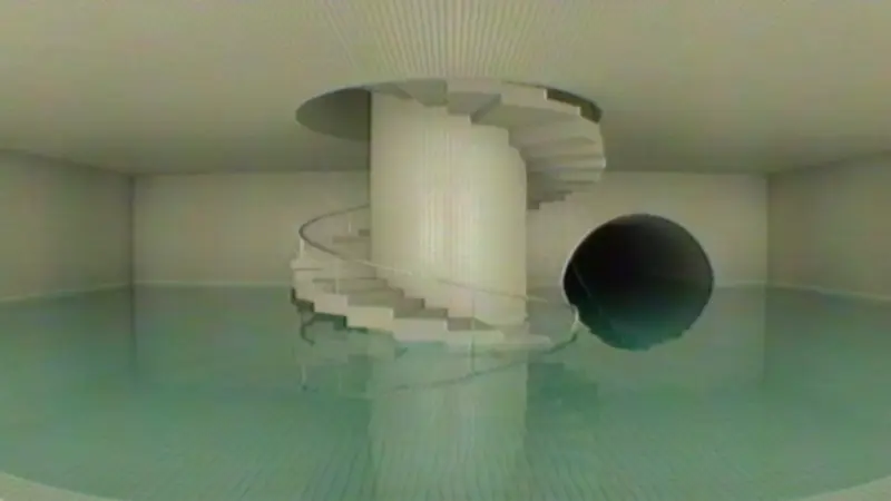 One of your first stops is the Dreampools — a haunting maze filled with endless pools emitting a faint, artificial glow. The stillness of the water contrasts sharply with your own echoing footsteps. Tiled walls shimmer with unsettling reflections, amplifying the surreal calm that hangs heavily in the air. Here, narrow hallways lead to vast, illogically interconnected chambers, where unsettling feelings persist, as if something watches from the shadows.