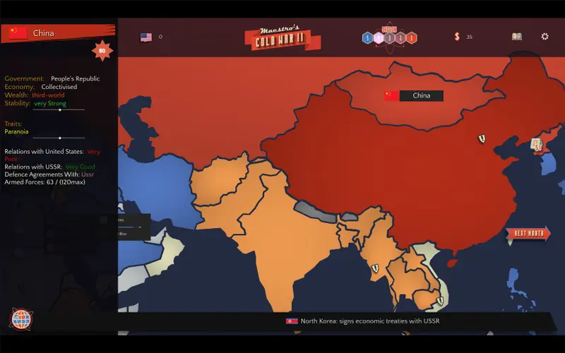 In Maestro's Cold War 2, players are thrust into the politically charged arena of the Cold War, where global influence hangs by a thread. Engage in a grand-strategy sandbox that perfectly balances accessibility and depth. You can choose to lead either the USA or the USSR in a race to earn prestige. With the world watching, will you successfully navigate the complexities of diplomacy and policy to achieve global dominance?
